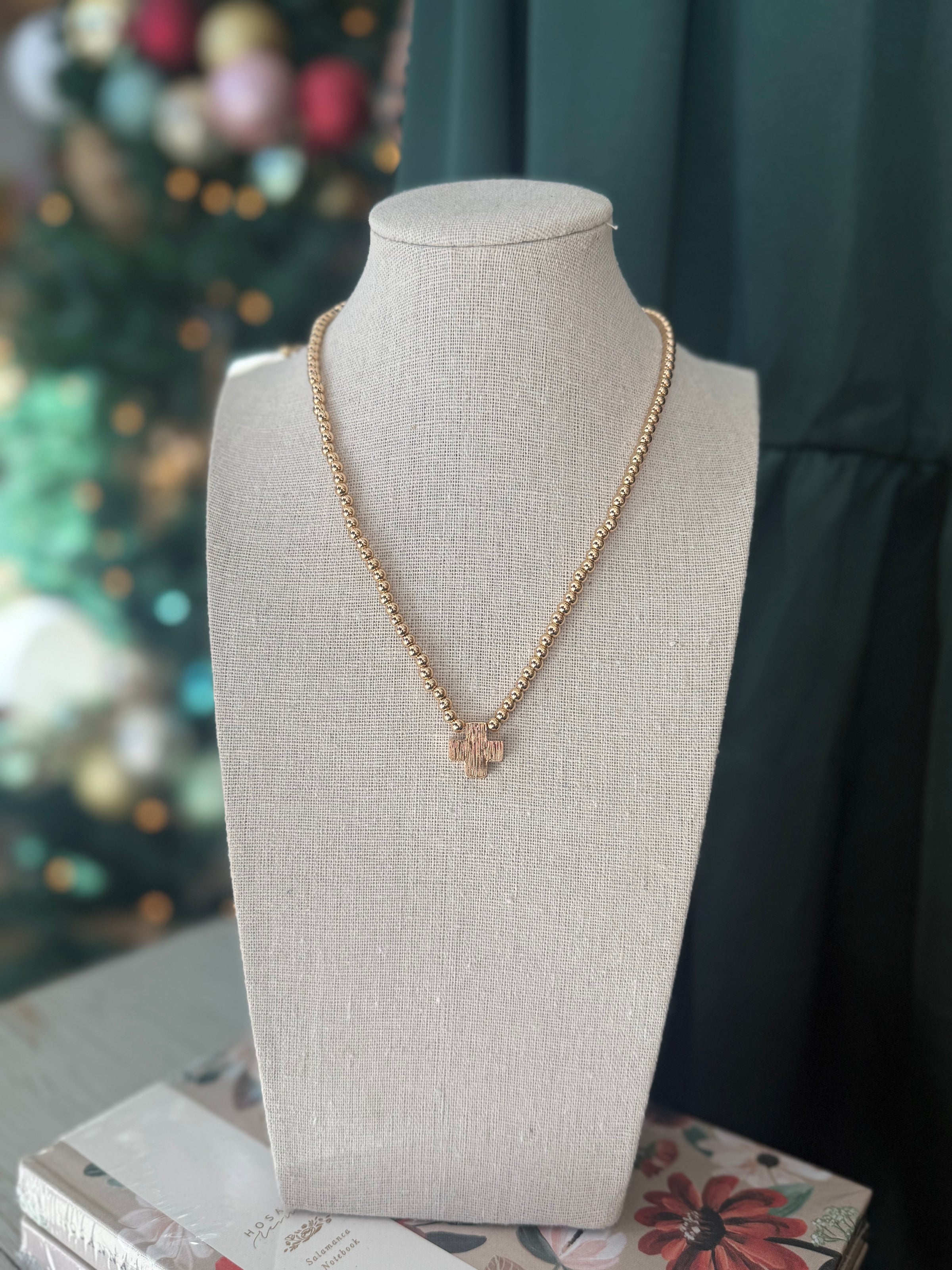 This cross copper coated bead necklace is lightweight and perfect for the minimal girly! Small golden beads have been paired with a dainty gold cross for a very sleek and minimal vibe.
