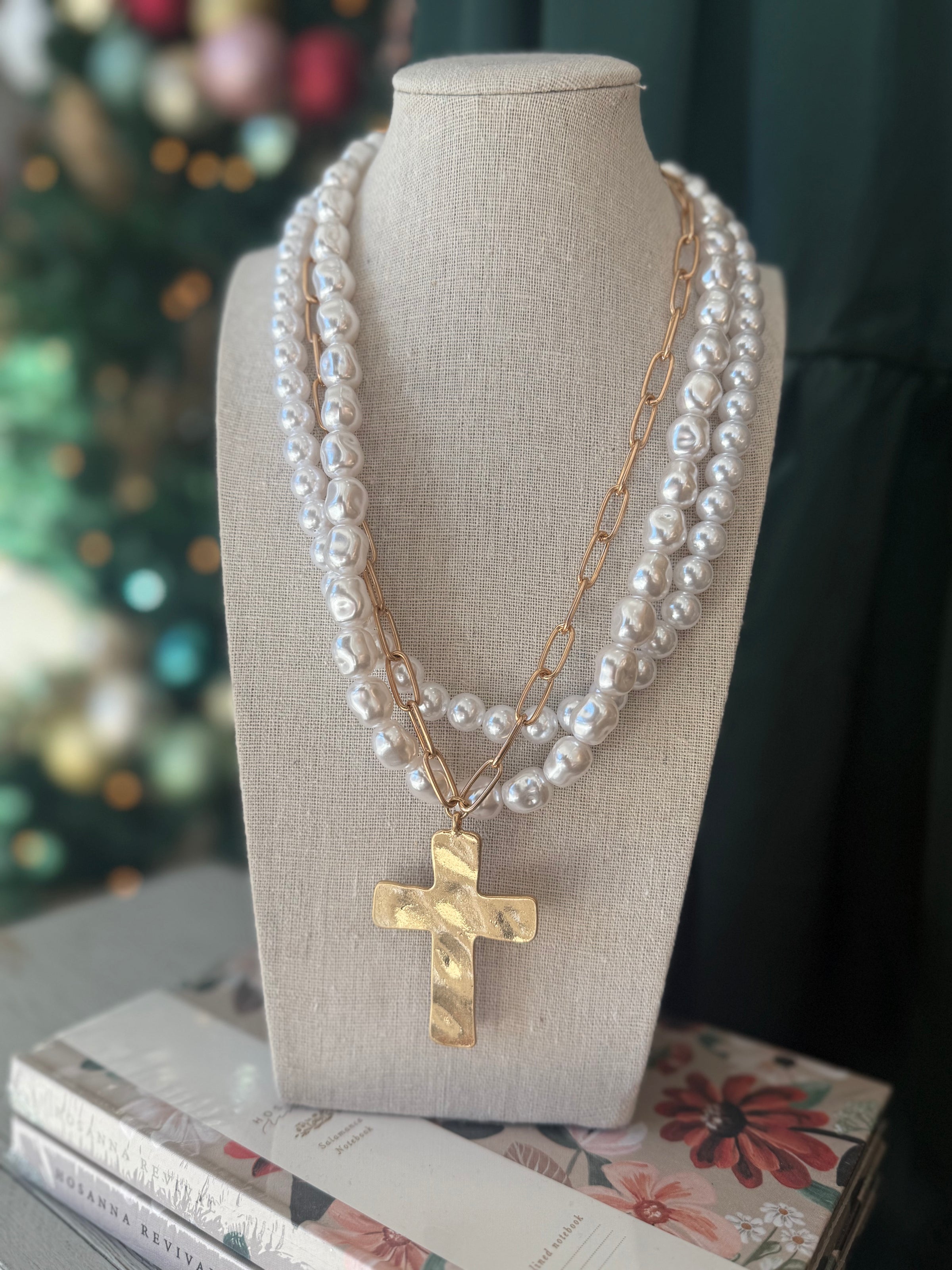 A beautiful bold yet unique strand of pearls accompanied by a trendy cross chain is the perfect way to make a statement this season!